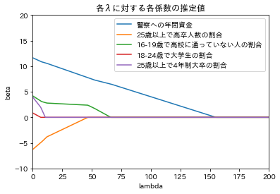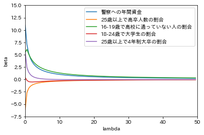 import numpy as np import copy import matplotlib.pyplot as plt %matplotlib inline import japanize_matplotlib def ridge(x,y, lam = 0): X = copy.copy(x) n, p = X.shape X_bar = np.zeros(p) s = np.zeros(p) for j in range(p): X_bar[j] = np.mean(X[:,j]) for j in range(p): s[j] = np.std(X[:,j]) X[:,j] = (X[:, j] - X_bar[j])/s[j] y_bar = np.mean(y) y = y - y_bar beta = np.linalg.inv(X.T@X + n * lam * np.eye(p))@X.T@y for j in range(p): beta[j] = beta[j] / s[j] beta_0 = y_bar - X_bar.T@beta return {'beta': beta, 'beta_0': beta_0} # テストデータ df = np.loadtxt("C:/Users/Julie/Downloads/crime.txt", delimiter = ",") X = df[:,[i for i in range(2,7)]] p = X.shape[1] y = df[:,0] lambda_seq = np.arange(0,50,0.5) plt.xlim(0,50) plt.ylim(-7.5,15) plt.xlabel("lambda") plt.ylabel("beta") labels = ["警察への年間資金","25歳以上で高卒人数の割合","16-19歳で高校に通っていない人の割合", "18-24歳で大学生の割合","25歳以上で4年制大卒の割合"] for j in range(p): coef_seq = [] for l in lambda_seq: coef_seq.append(ridge(X,y,l)['beta'][j]) plt.plot(lambda_seq, coef_seq, label = "{}".format(labels[j])) plt.legend(loc = "upper right")