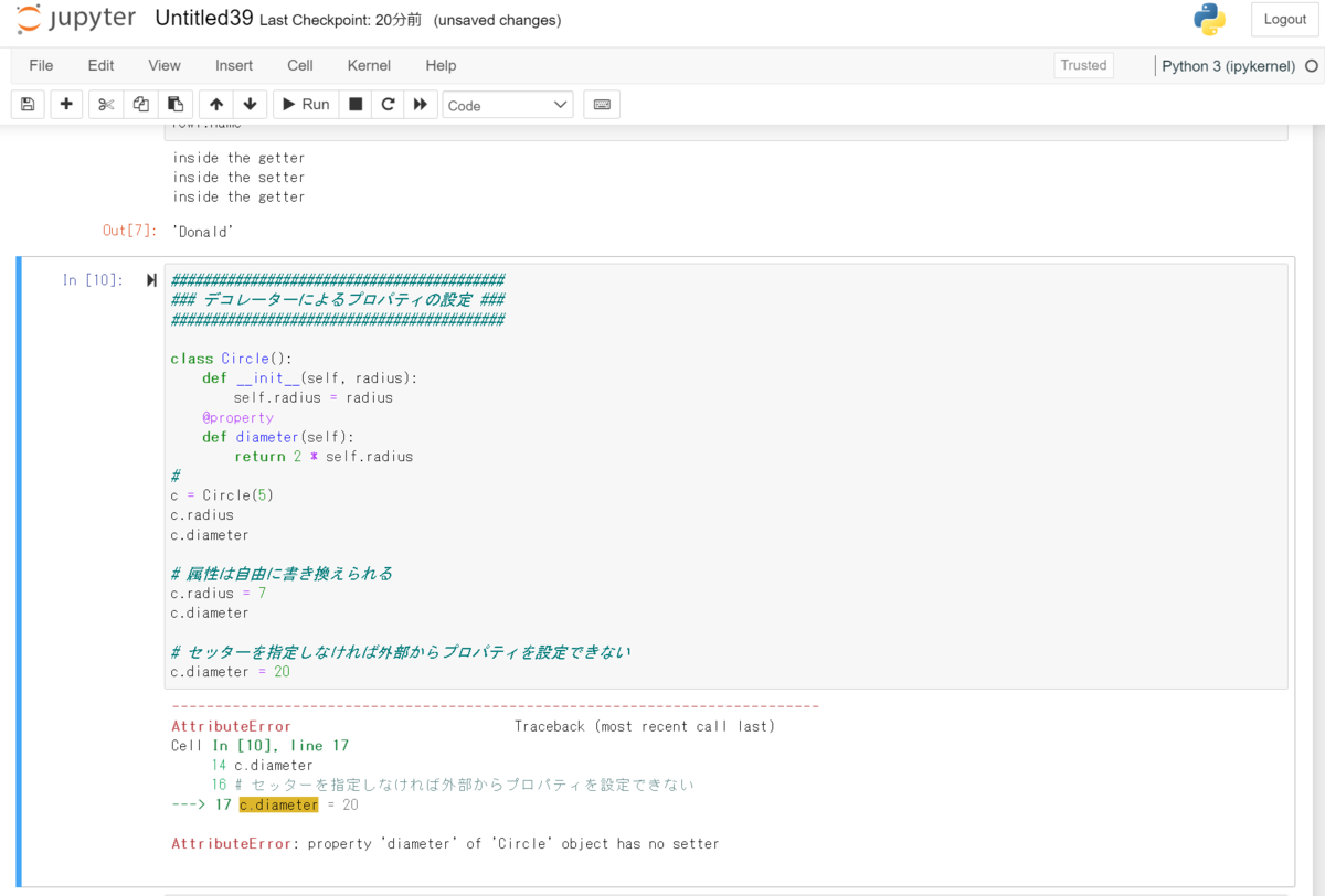 ########################################## ### デコレーターによるプロパティの設定 ### ########################################## class Circle(): def __init__(self, radius): self.radius = radius @property def diameter(self): return 2 * self.radius # c = Circle(5) c.radius c.diameter # 属性は自由に書き換えられる c.radius = 7 c.diameter # セッターを指定しなければ外部からプロパティを設定できない c.diameter = 20